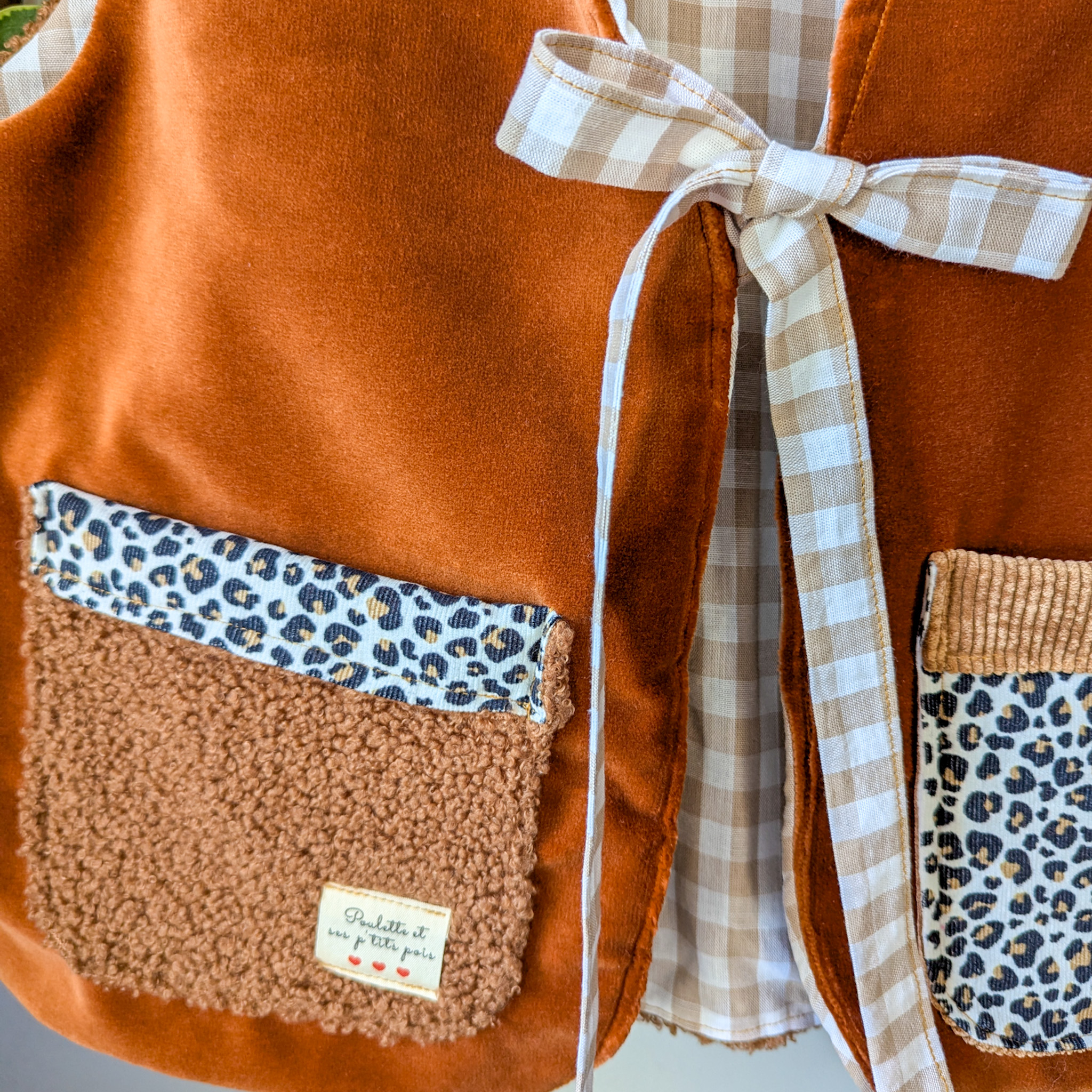 Velours et intérieur en coton vichy beige.