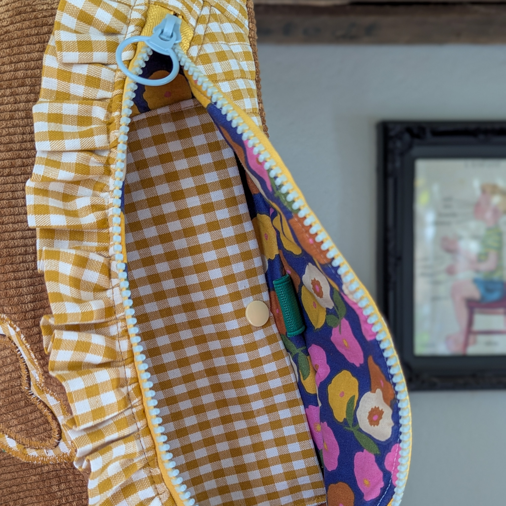A l’intérieur de la bananette j’y ai cousu une poche avec une bouton pression pour y ranger tes petites affaires. Et tu découvriras le petit plus, un élastique de couleur pour y glisser un crayon ! C’est top ça non ?